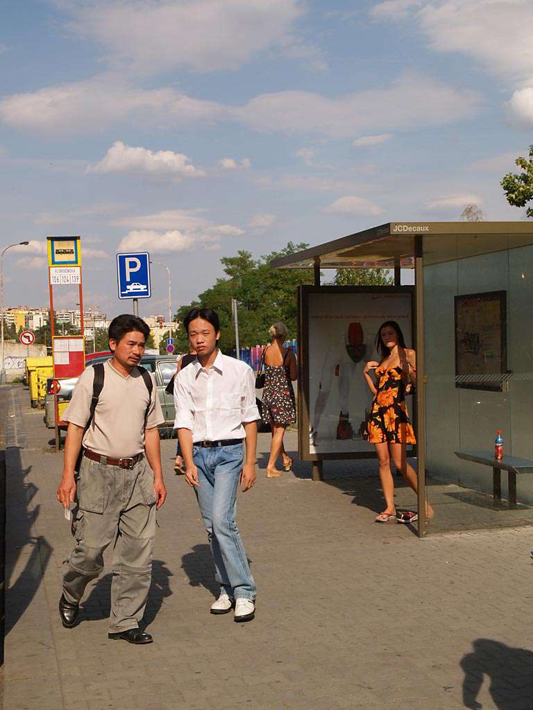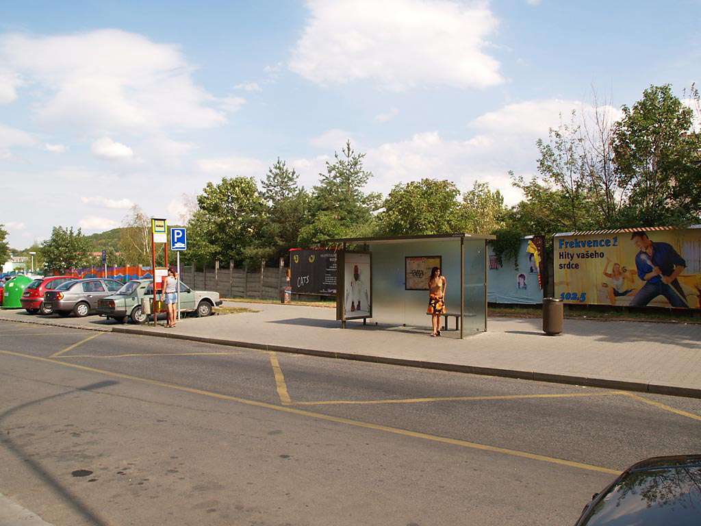 At a bus stop and at a kiosk